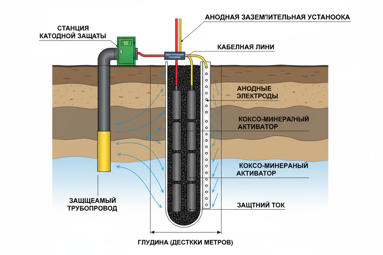 Анодное заземление — это невидимый, но крайне важный элемент системы катодной защиты. Без него электрохимическая защита не сможет стабильно работать. Анодный заземлитель — это «контакт» системы с грунтом, через который в почву уходит защитный ток, создающий потенциал, предотвращающий коррозию металла трубопровода.
